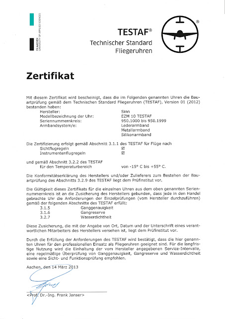 Von der Fakultät für Luft- und Raumfahrttechnik an der Fachhochschule Aachen (FH), nach einem Vorschlag von Sinns Besitzer Lothar Schmidt im Jahr 2008, ist TESTAF ( Technischer Standard Fliegeruhren oder "technische Standards für Pilotenuhren") ein Satz von Objektive Kriterien für Pilotenuhren.